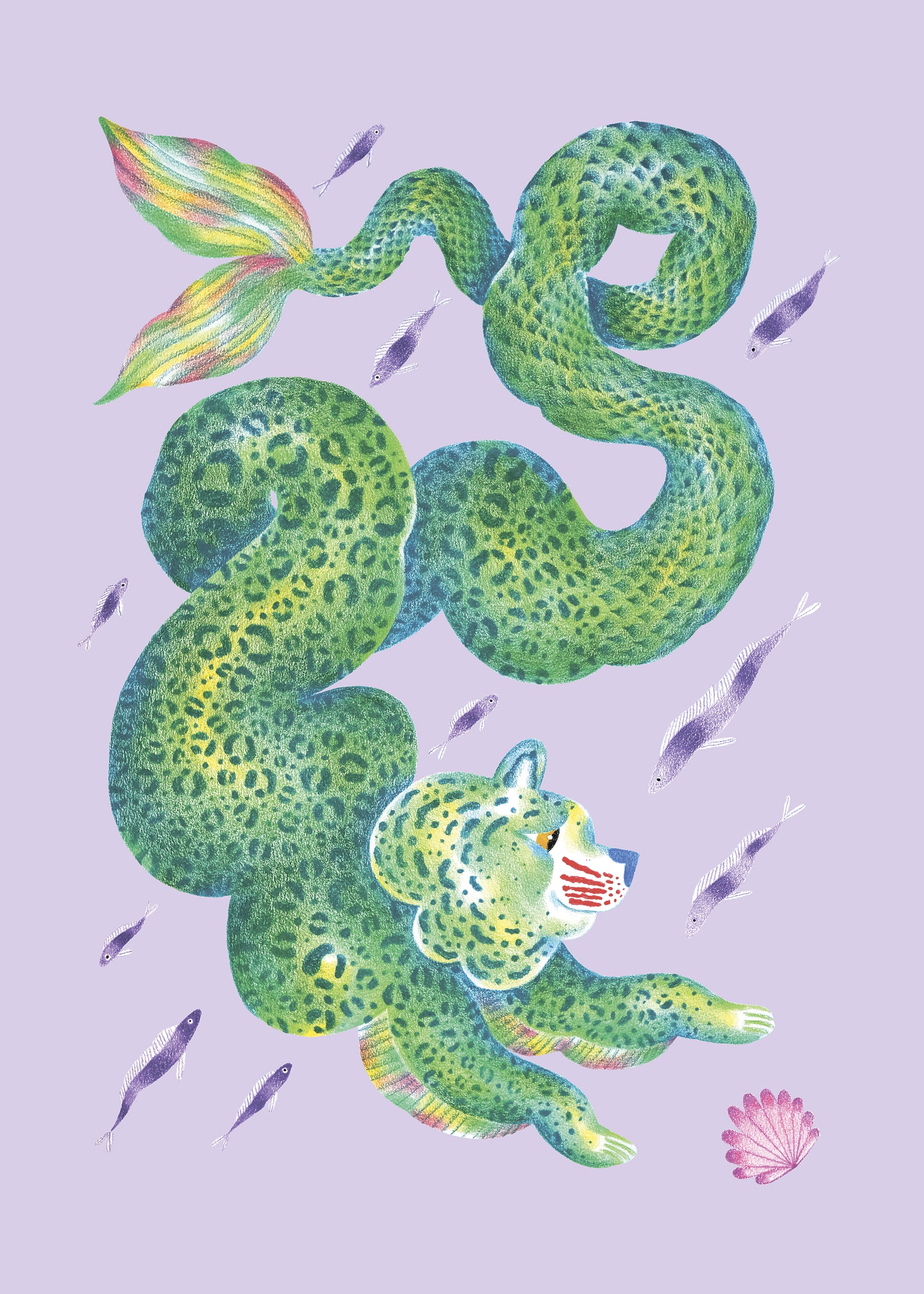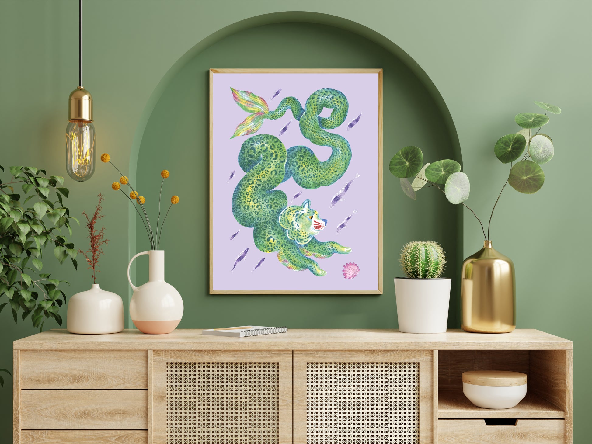 Poster with a Mystical Underwater Mermaid Leopard! Original illustration drawn by me with colored pencils :)