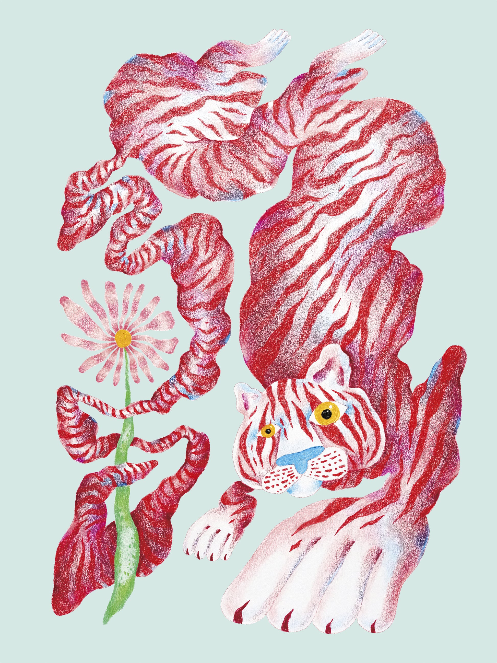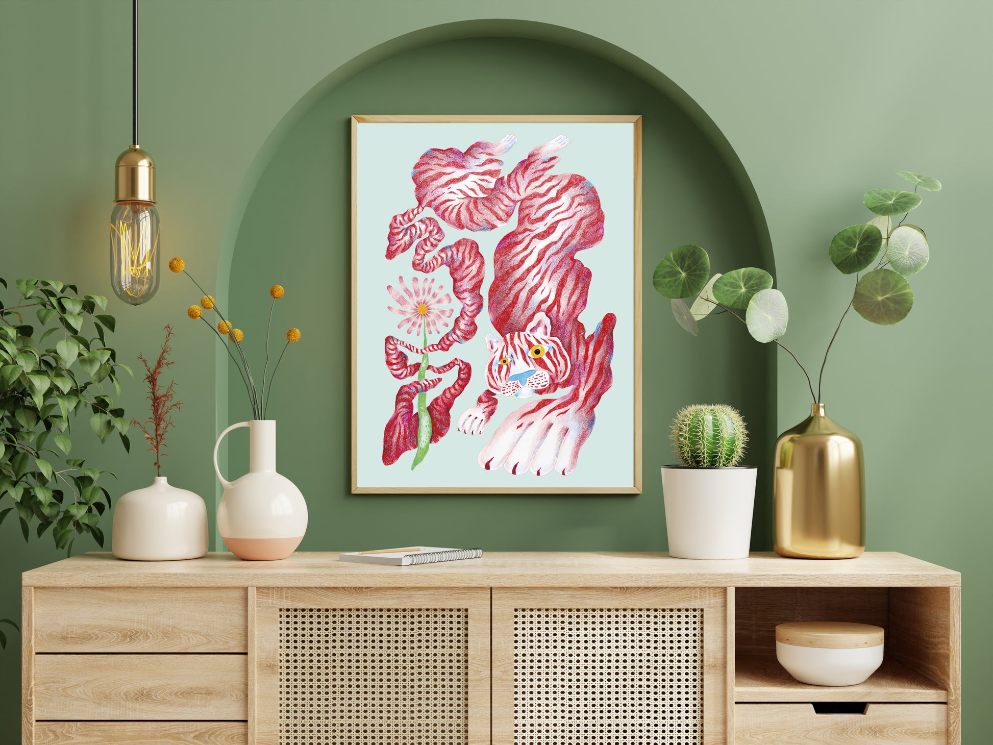 Poster with a Tiger who loves flowers :) Original illustration drawn by me with colored pencils :)