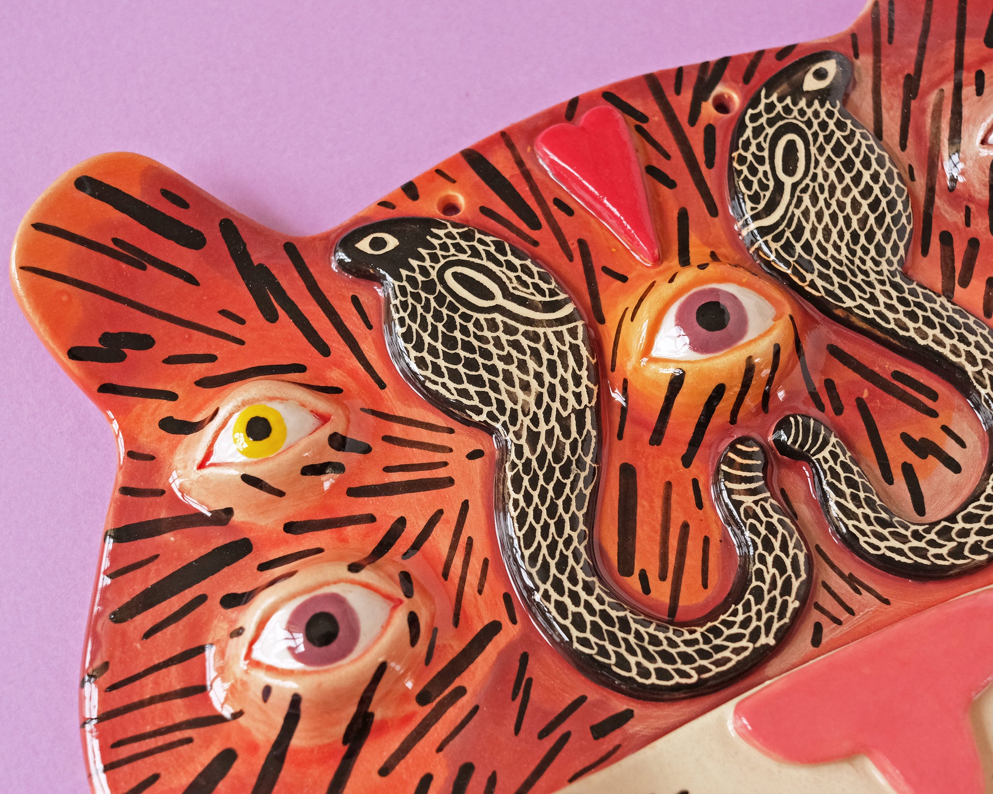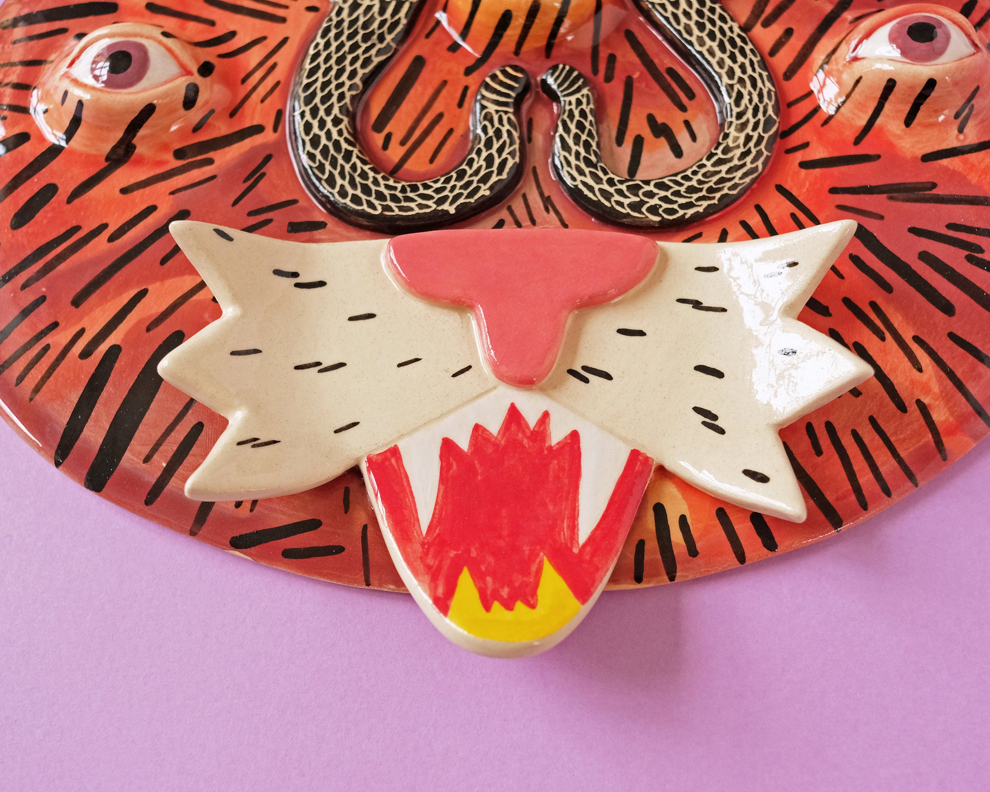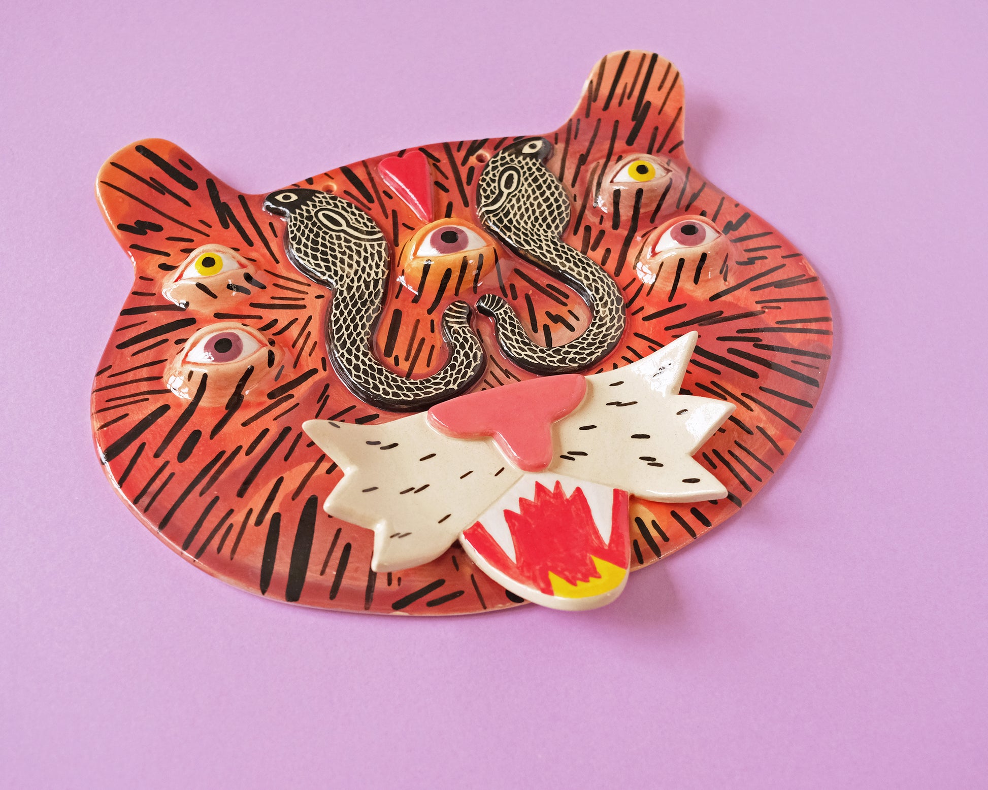 Unique one of a kind ceramic wall mask with the Tiger with 2 Snakes.