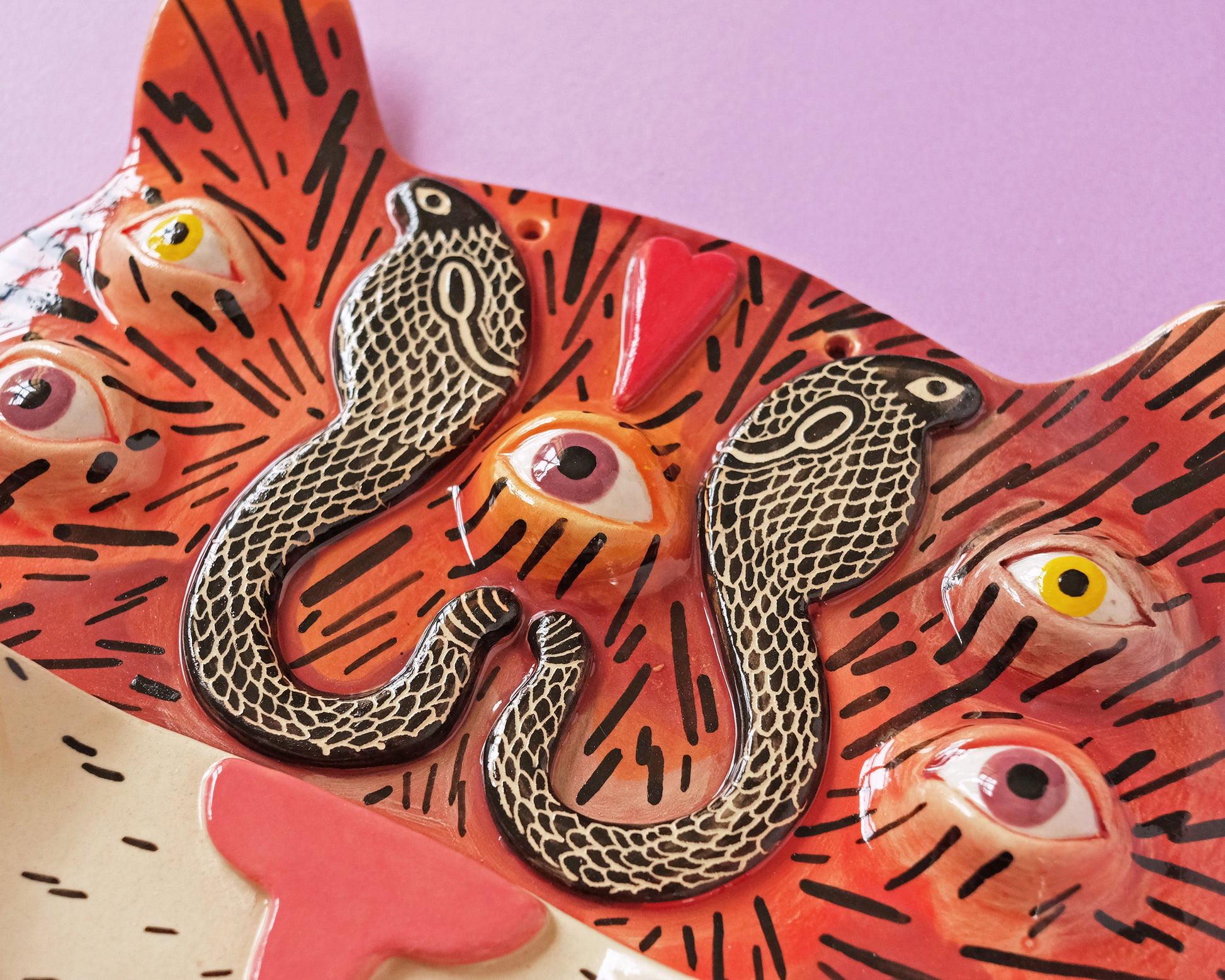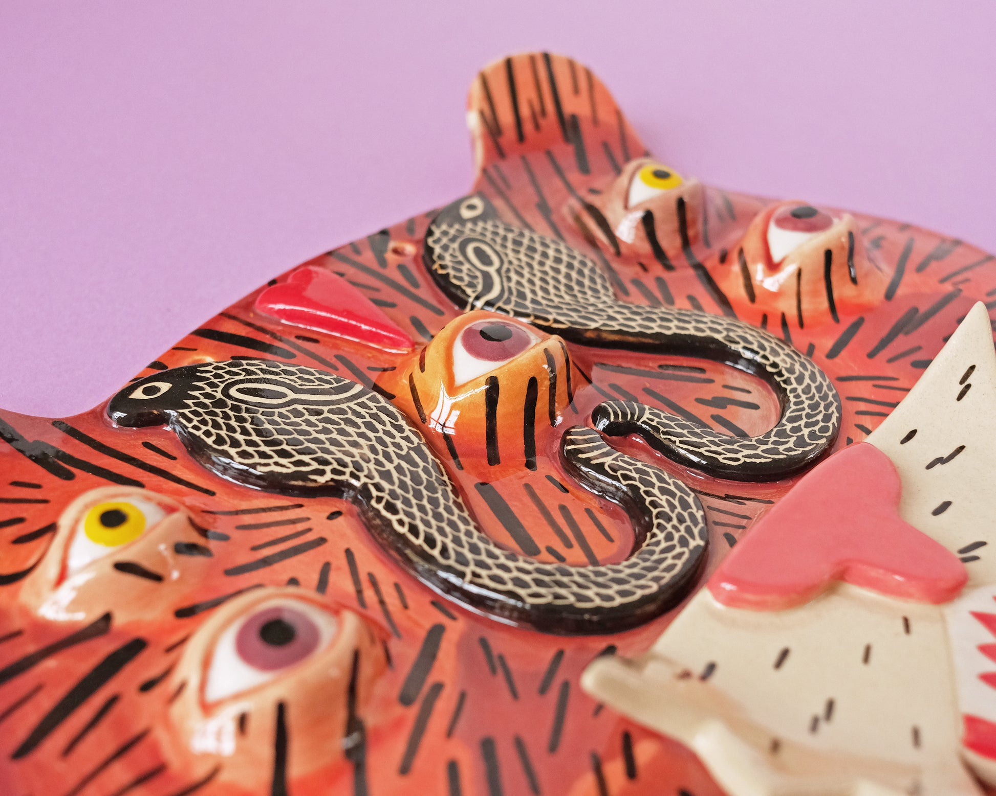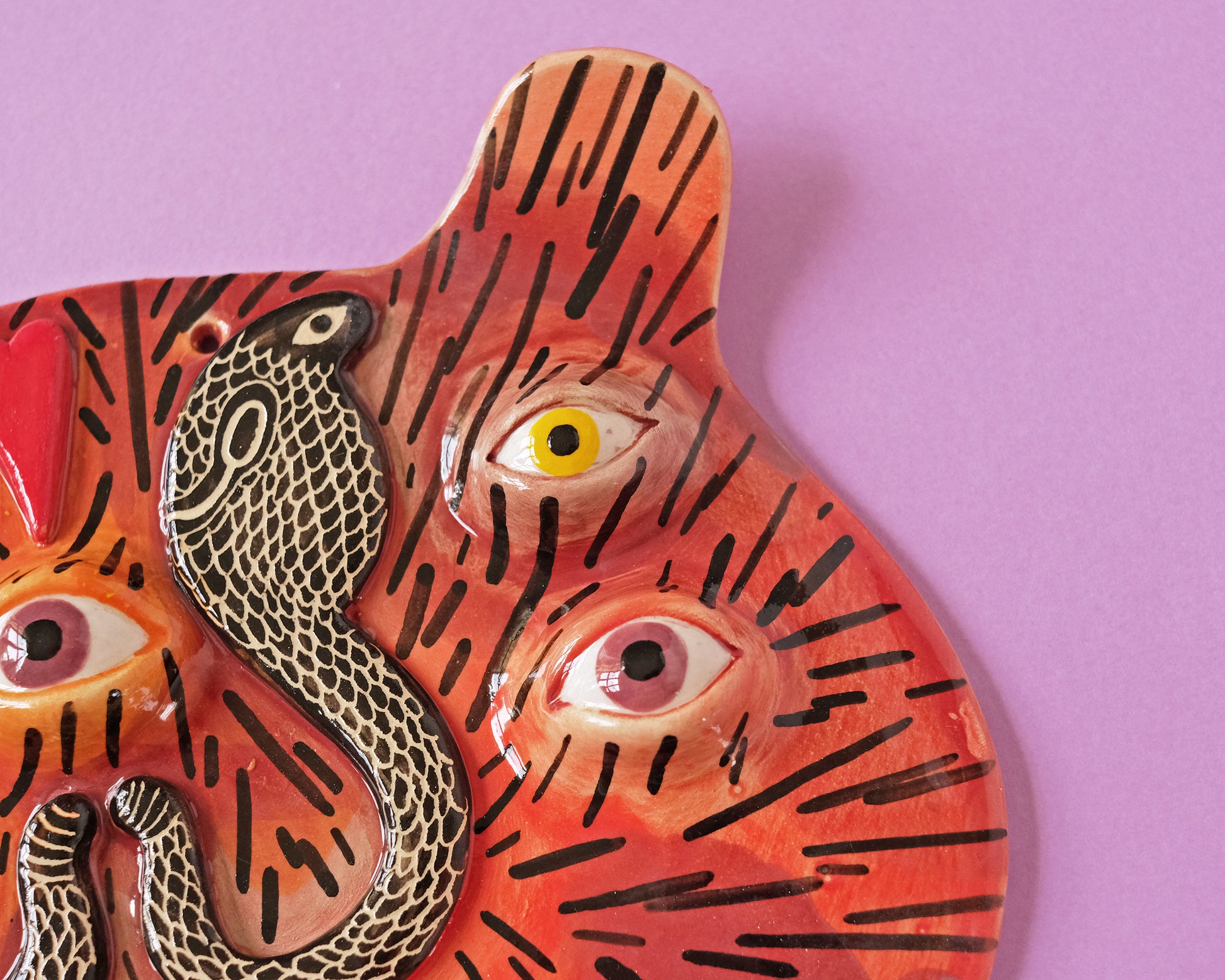 Unique one of a kind ceramic wall mask with the Tiger with 2 Snakes.